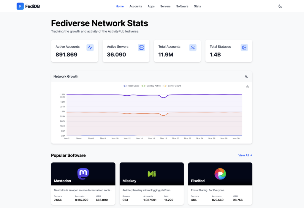 Mittlerweile verfügt das Fediverse (laut FediDB, Stand Dezember 2025) über 12 Millionen registrierte Nutzer, davon sind etwa 890.000 Accounts aktiv, bei insgesamt 1,4 Milliarden Statusmeldungen und über 35.000 Instanzen bzw. Servern.