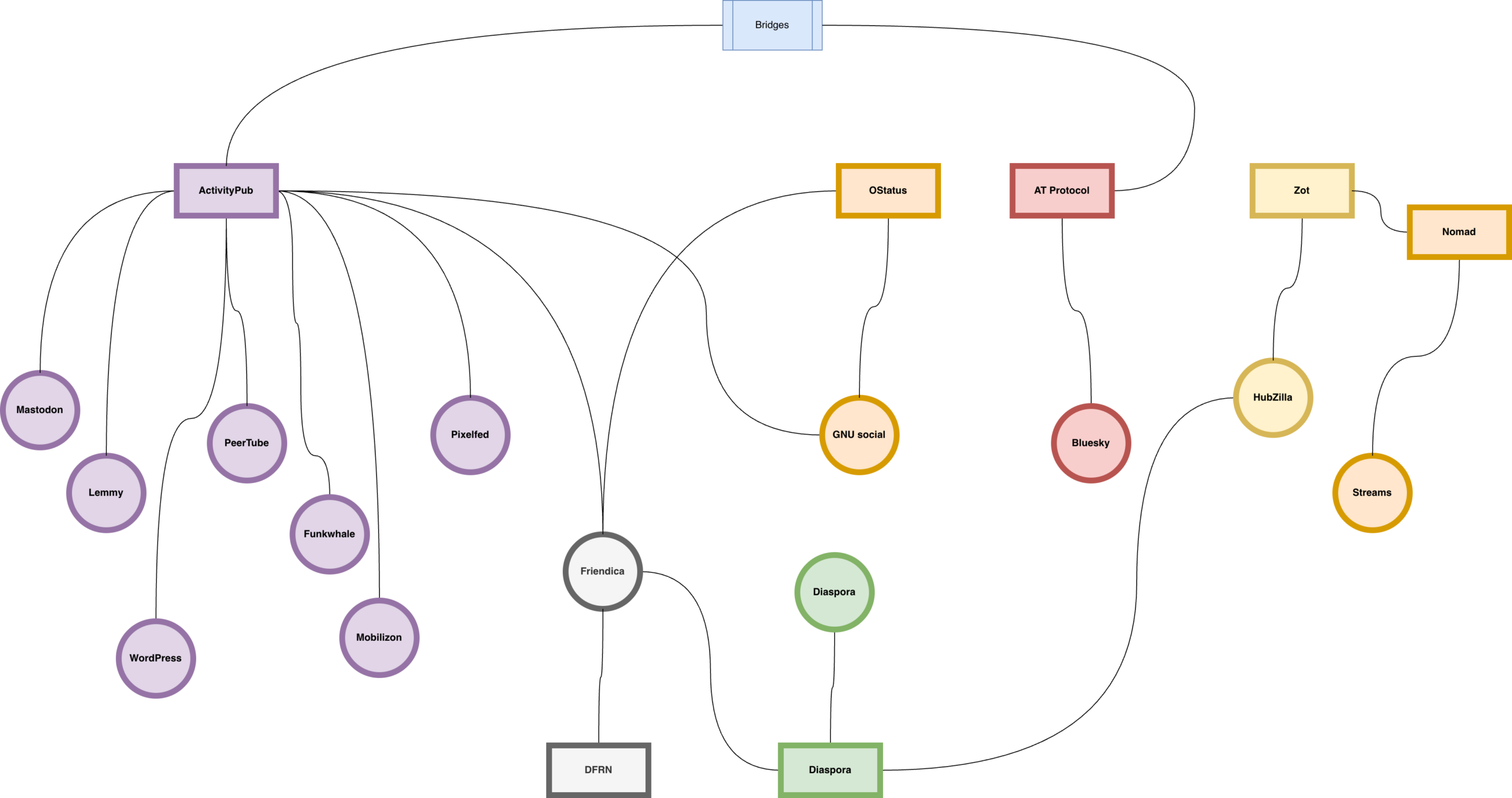Zeitgleich entwickelte sich mit Diaspora ab 2010 eine weitere föderierte Plattform, die auf einem eigenen Protokoll basierte, aber das Prinzip dezentraler, selbstverwalteter Instanzen ebenfalls konsequent umsetzte.