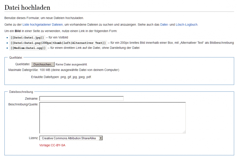 Beim Upload einer Datei in einer MediaWiki-Installation ist es möglich eine Lizenz anzugeben. Standardmäßig ist in der Liste der Lizenzen allerdings kein Eintrag zu finden.