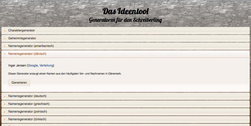 Unter ideentool.de betreibe ich eine kleine Webapplikation, welche verschiedene Tools für den geneigten Autor bereitstellt. So gibt es unter anderem Namens-, Titel und Charaktergeneratoren.