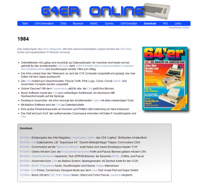 Von 1984 bis 1999 gab es für den Heimcomputer Commodore 64 eine äußert informative und ambitionierte Zeitschreft unter dem Namen 64’er. Diese Zeitschrift kann man mittlerweile online lesen.