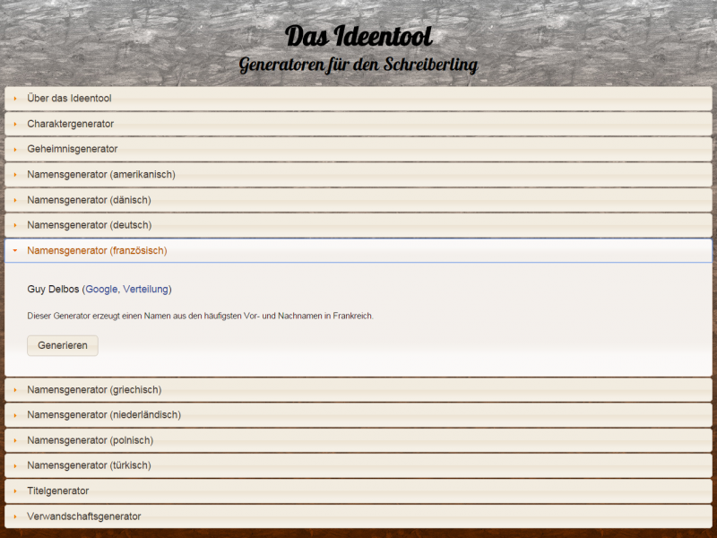Neben der Behebung einiger kleinerer Fehler, ist in dieser Version ein neuer Namensgenerator für französische Namen dazugekommen. Zu finden ist das Ideentool unter ideentool.de.
