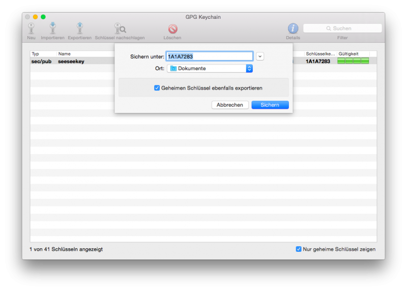Unter Mac OS X wird dazu die GPG Keychain geöffnet und dort auf den entsprechenden Schlüssel geklickt. Im Kontextmenü muss der Punkt Exportieren ausgewählt werden. In dem sich öffnenden Dialog muss die Checkbox Geheimen Schlüssel ebenfalls exportieren ausgewählt sein. Damit wird der öffentliche und der private Schlüssel in eine ASCII-Datei exportiert, welche anschließend sicher verwahren kann.