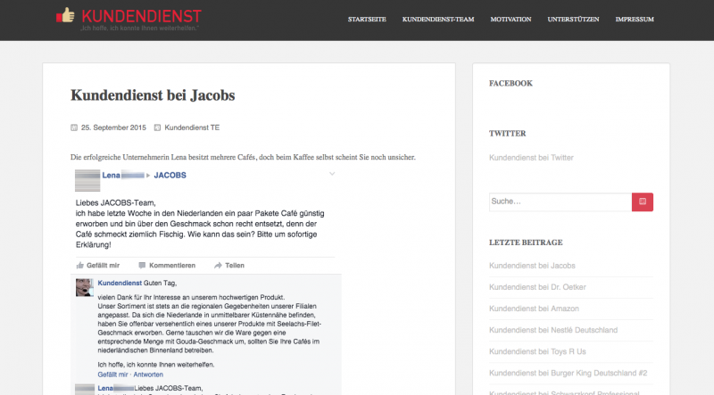 Seit einiger Zeit gibt es auf Facebook den Account kundendienstmitarbeiter oder kurz Kundendienst. Der „Dienst“ antwortet dabei mit scharfer Zunge auf Kommentare von Kunden auf den jeweiligen Seiten der Unternehmen – und versteht sich somit als freiwilliger Community-Manager.
