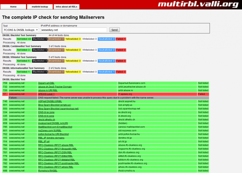 Manchmal kommt es vor das ein Server welchen man betreut oder betreibt auf einer DNS-based Blackhole List landet. In einem solchen Fall gilt es zu überprüfen ob man nur auf einer oder zwei dieser Listen steht, oder ob man global aufgeführt ist.