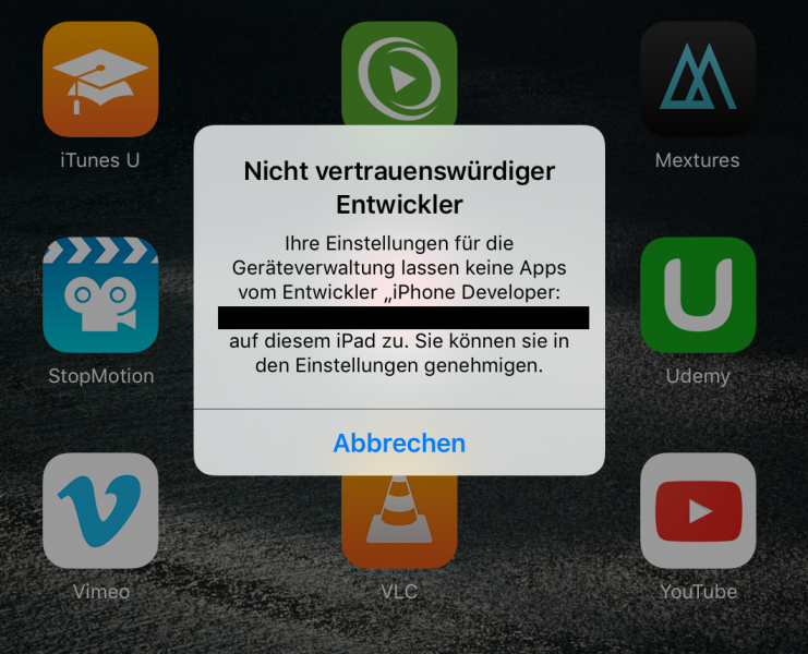 Beim Start der App kommt es allerdings zu einem Sicherheitsproblem. Grund dafür ist das der Entwickleraccount auf dem iOS-Gerät freigeschaltet werden muss. Dazu öffnet man die Einstellungen unter iOS und sucht dort den Punkt Allgemein -> Profil. In diesem Punkt muss der entsprechende Entwickleraccount als vertrauenswürdig gekennzeichnet werden. Anschließend kann die übertragende App ohne Probleme gestartet werden.