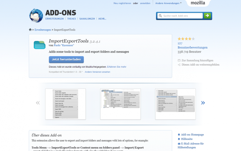 Möchte man mit Boardmitteln unter Thunderbird EML-Dateien importieren, so schaut man in die Röhre. Gelöst werden kann das Problem mit dem ImportExportTools Add-On für Thunderbird.