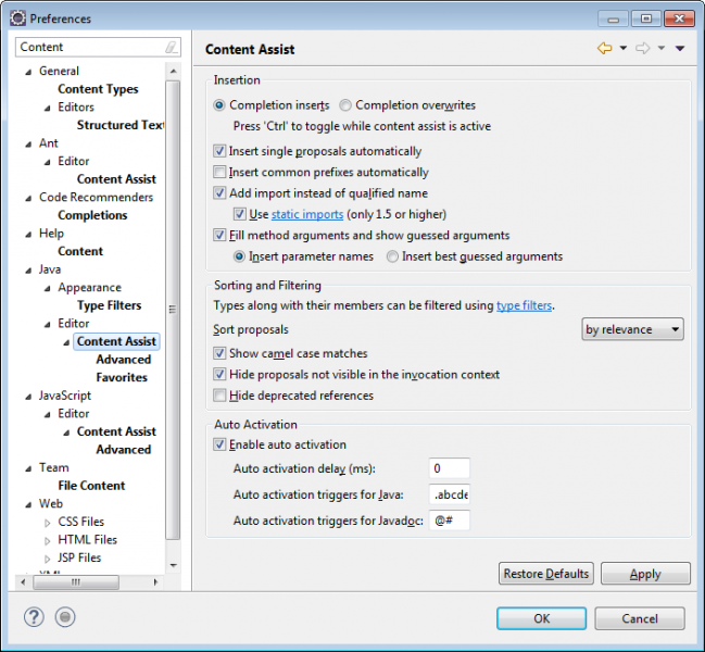Dazu müssen die Einstellungen unter Window -> Preferences -> Java -> Editor -> Content Assist aufgerufen werden. Dort gibt es den Punkt Auto Activation. In das Feld Auto activation triggers for Java trägt man nun: