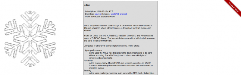Eine Lösung um einen solchen DNS Tunnel einzurichten ist iodine. Mit iodine ist es möglich IPv4-Verkehr über DNS zu tunneln. Pro DNS-Request können dabei bis zu einem Kilobyte an Daten übertragen werden, was sich positiv auf die Performance und den Durchsatz auswirkt. iodine läuft dabei auf vielen unixodien Systemen, sowie unter Windows. Lizenziert ist iodine unter der ISCL und damit freie Software. Der Quelltext ist auf GitHub zu finden.