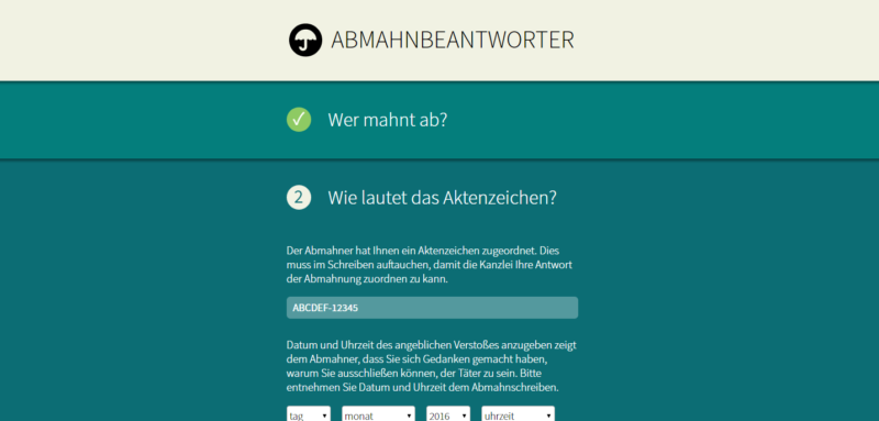 Der Abmahnbeantworter stellt dem Nutzer dabei einige Fragen und erzeugt anschließend ein vorgefertigtes Antwortschreiben, welches im Detail erläutert warum man für besagte Urheberrechtsverletzung nicht in Frage kommt. Das ganze wurde dabei von Anwälten geprüft – wobei man beachten sollte das der Abmahnbeantworter wirklich nur für Fälle gedacht ist in denen man besagte Verletzung des Urheberrechts nicht begangen hat.