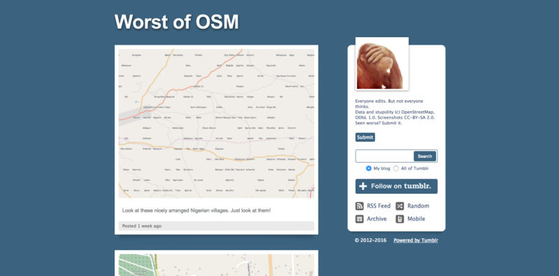 Eine Liste solcher Fehlschläge ist im Tumblr-Blog Worst of OSM zu finden. Von winzigen Häusern, interessant getaggten Imbissgelegenheiten bis zum Mißbrauch des freien Tag-Schemas ist dabei alles zu finden – damit findet der geneigte OpenStreetMap-Mapper seine tägliche Portion Grusel.