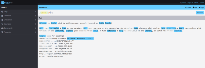 Reguläre Ausdrücke sind mächtig. Wenn man einen solchen Ausdruck entwickelt z.B. um eine Zeichenkette zu extrahieren, ist es enorm hilfreich das ganze zeitnah zu debuggen. Mit der Webseite regexr.com gibt es dafür einen Dienst mit welchem eigene reguläre Ausdrücke schnell überprüft und getestet werden können. Dabei wird der Ausdruck auf der Seite eingegeben und anschließend gegen den angegebenen Text überprüft.
