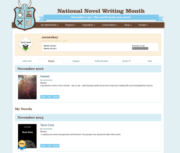 Im letzten Jahr nahm ich das erste Mal am NaNoWriMo teil (NaNoWriMo is coming, NaNoWriMo – Tag 1, NaNoWriMo – Tag 4, NaNoWriMo – Tag 13, NaNoWriMo – Tag 18, NaNoWriMo – Tag 26, NaNoWriMo — Tag 30 – vom Endspurt zum fertigen Entwurf) und auch dieses Jahr ist das Ziel wieder 50.000 Wörter zu einem ersten Romenentwurf zu schreiben. Möchte man am NaNoWriMo teilnehmen, so kann man dies jederzeit unter nanowrimo.org tun. Nach der Anmeldung kann das Profil und der geplante Roman angelegt werden – habt ihr den NaNoWriMo Ende November überstanden dürft ihr euch anschließend Schriftsteller schimpfen.