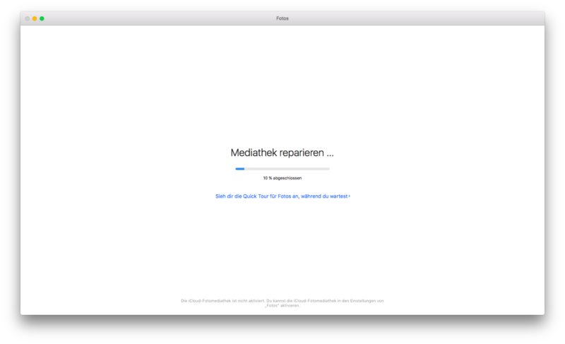 Anschließend wird sie über das Icon mit gedrückter Command– und Optionstaste wieder gestartet. Damit wird die Fotos-App im Reparaturmodus gestartet. Die Reparatur muss nach dem Start bestätigt werden. Danach beginnt der eigentliche Reparaturvorgang, der je nach Größe der Mediathek durchaus einige Stunden in Anspruch nehmen kann.