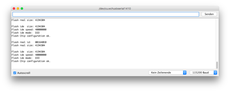 Nachdem die Arduino IDE mit dem Programm geöffnet wurde und das Programm auf das NodeMCU-Board geflasht wurde, kann die Ausgabe über die serielle Schnittstelle ausgelesen werden. Dazu muss der serielle Monitor, im Menü unter Werkzeuge -> Serieller Monitor zu finden, aktiviert werden. Wichtig ist es, dass hier die korrekte Baudrate eingestellt wird.
