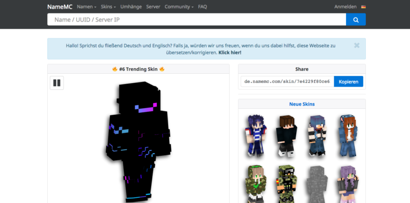 NameMC, welches unter namemc.com zu finden ist, ermöglicht das Durchforsten der Namensdatenbank. Daneben können auf der Webseite Skins gesucht und direkt über das Mojang-Profil auf den Minecraft-Charakter angewendet werden.