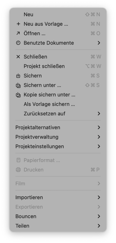 Nach einem Update auf die 12er-Version von Logic Pro, ergab sich das Problem, dass im Menü Ablage der Punkt Exportieren komplett ausgeblendet war.